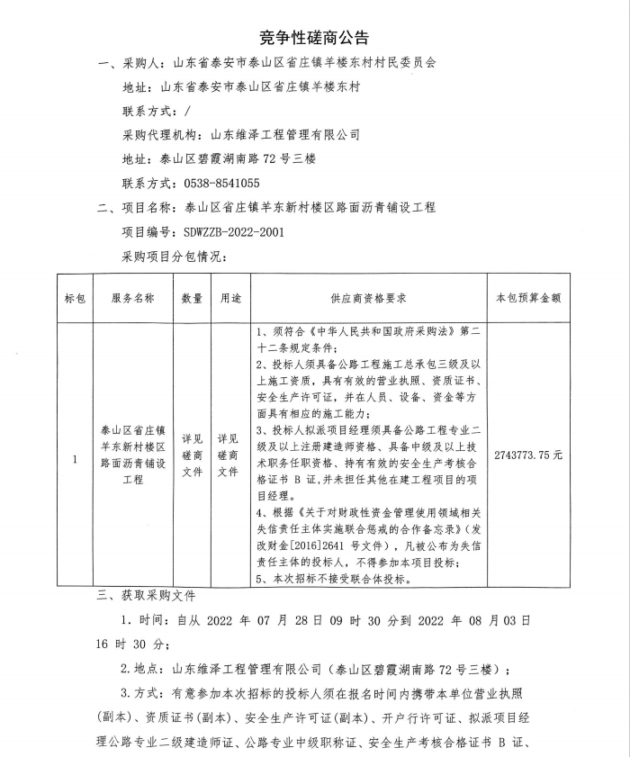 泰山区省庄镇羊东新村楼区路面沥青铺设工程竞争性谈判公告